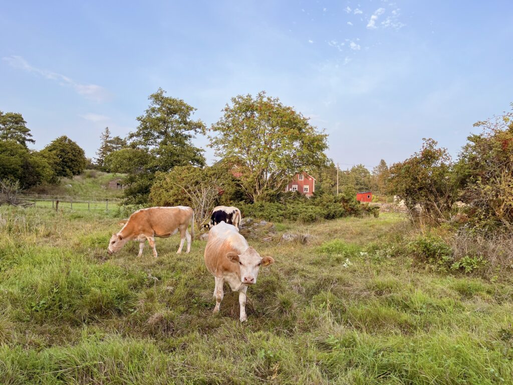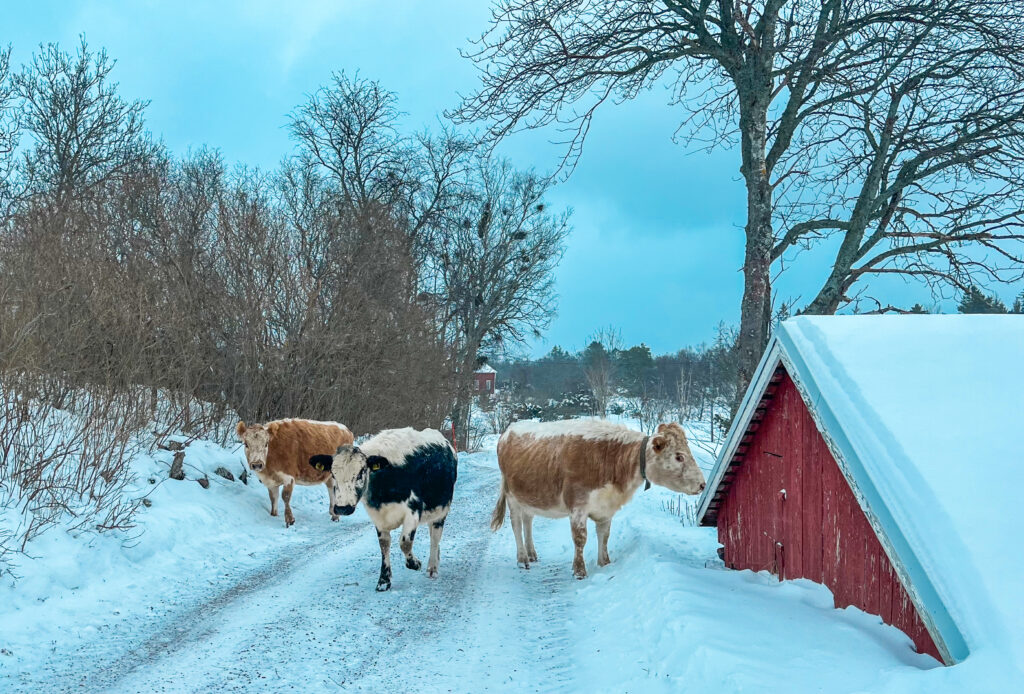 Lantraskorna på Seglinge är till största delen östfinska, som kallas i fastlandet till ‘Kyyttö’. Även den en hotad ras. Jag hämtade de första från fastlandet Finland i december 2022. Korna är ute hela året, och är lika sociala som Ålandsfåren.